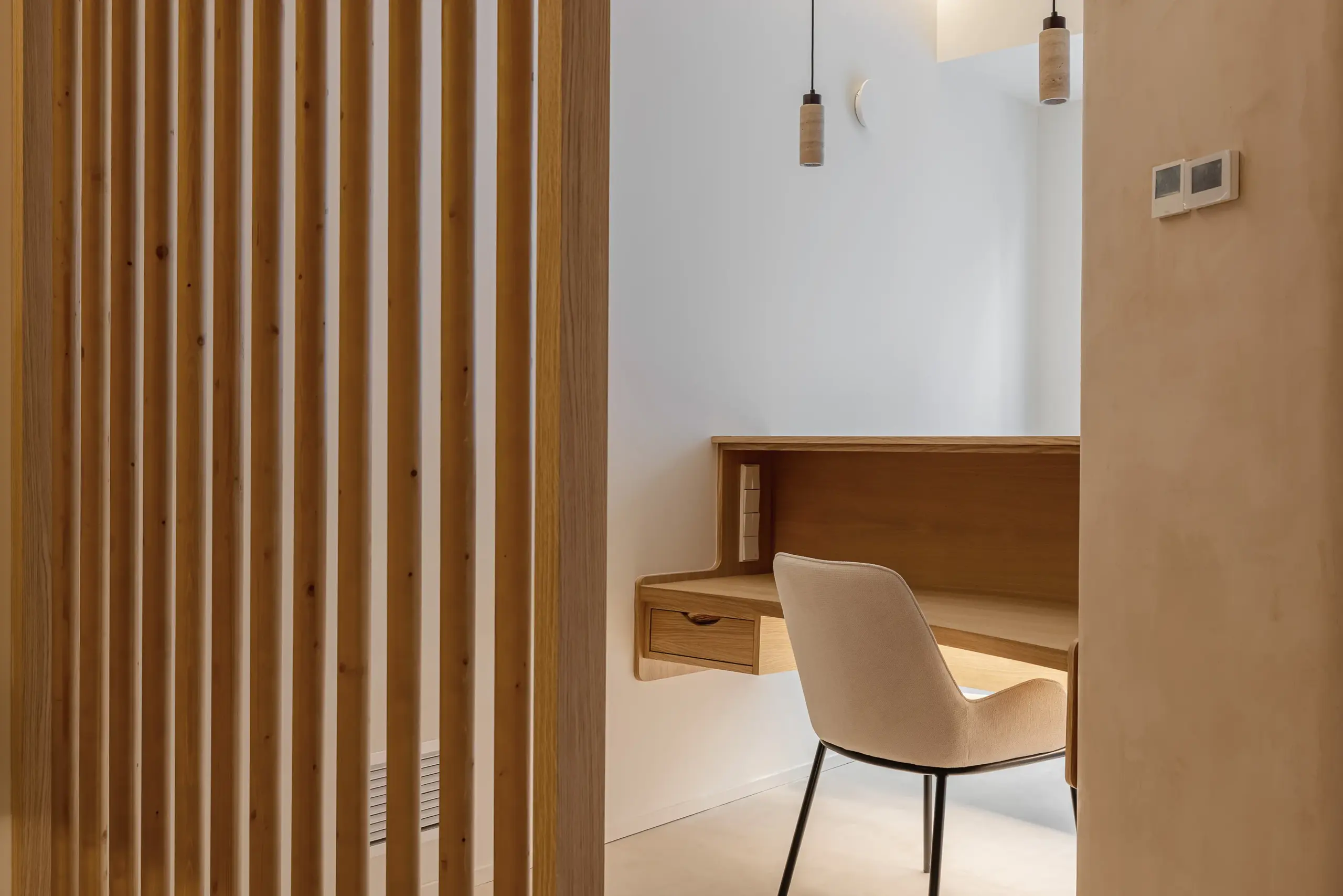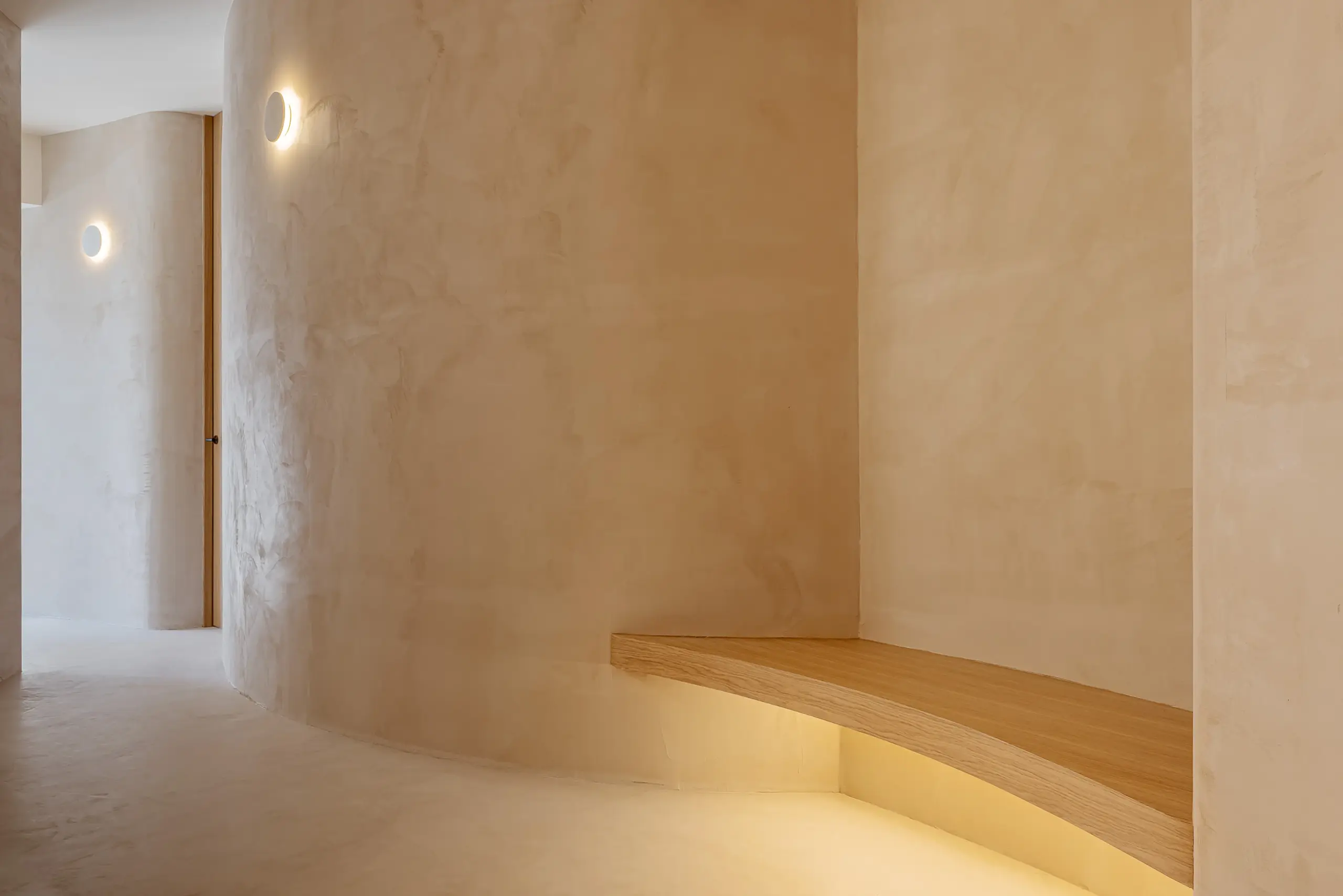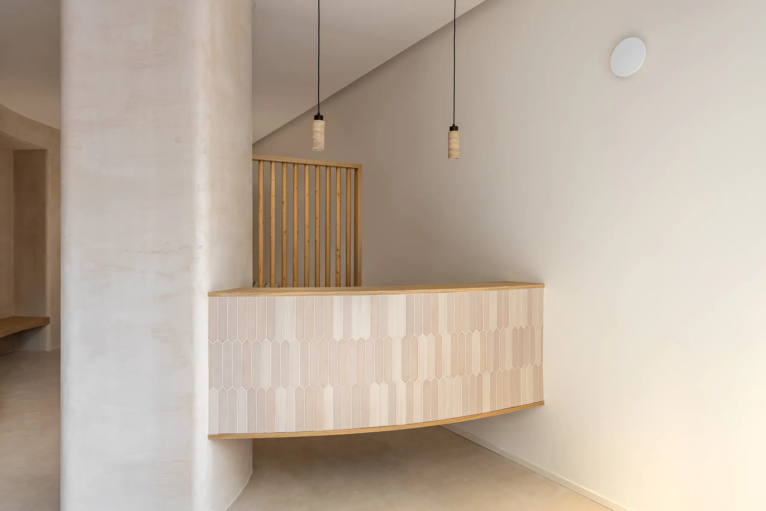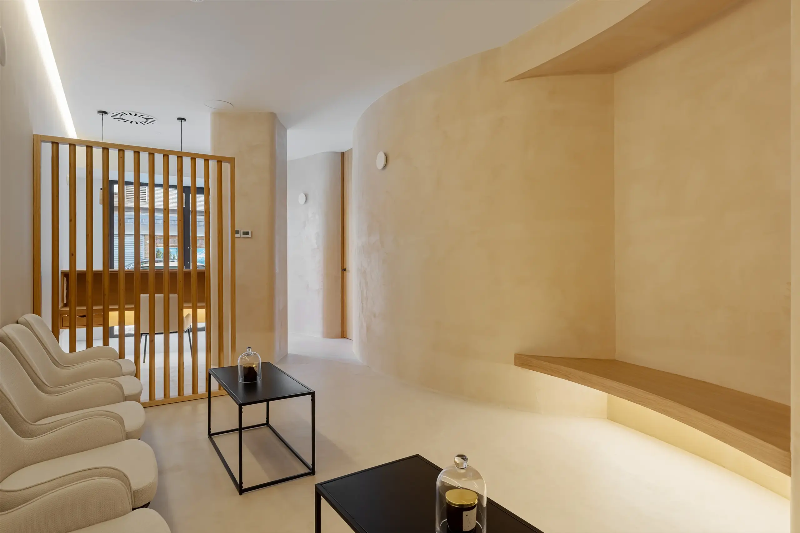 Las soluciones en pladur permitieron dar forma a pilares redondeados y tabiques curvos, un recurso que aporta dinamismo al espacio. Esa misma idea se trasladó a los elementos de carpintería, donde el mostrador de recepción, diseñado a medida con un frente cerámico, y el banco curvo de la zona de espera, refuerza esa continuidada del diseño añadiendo un toque de calidez.
