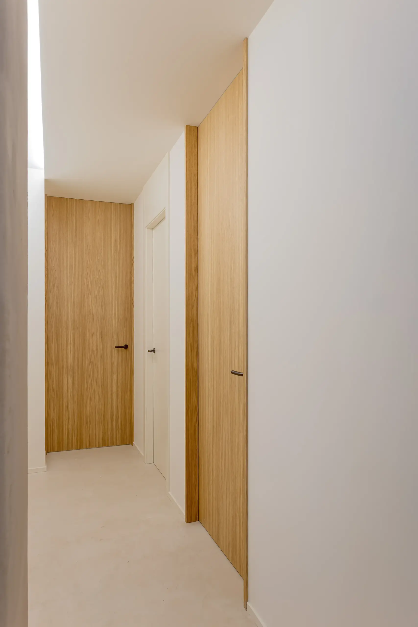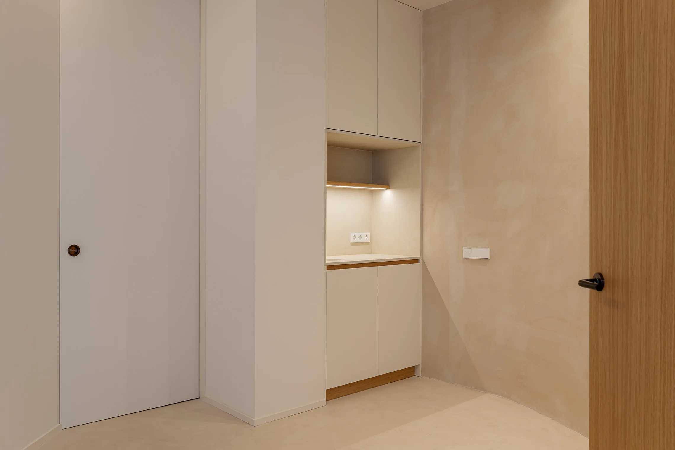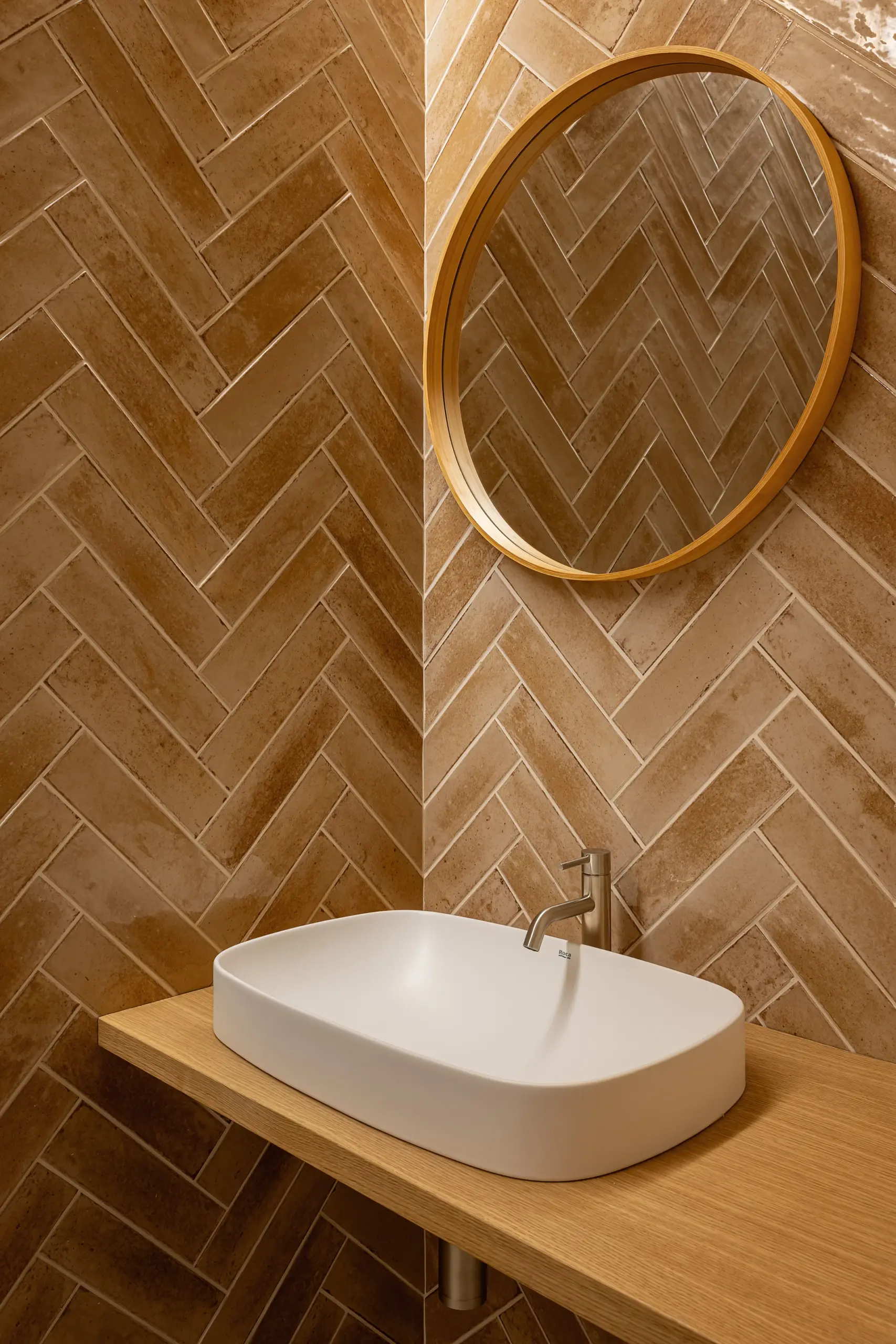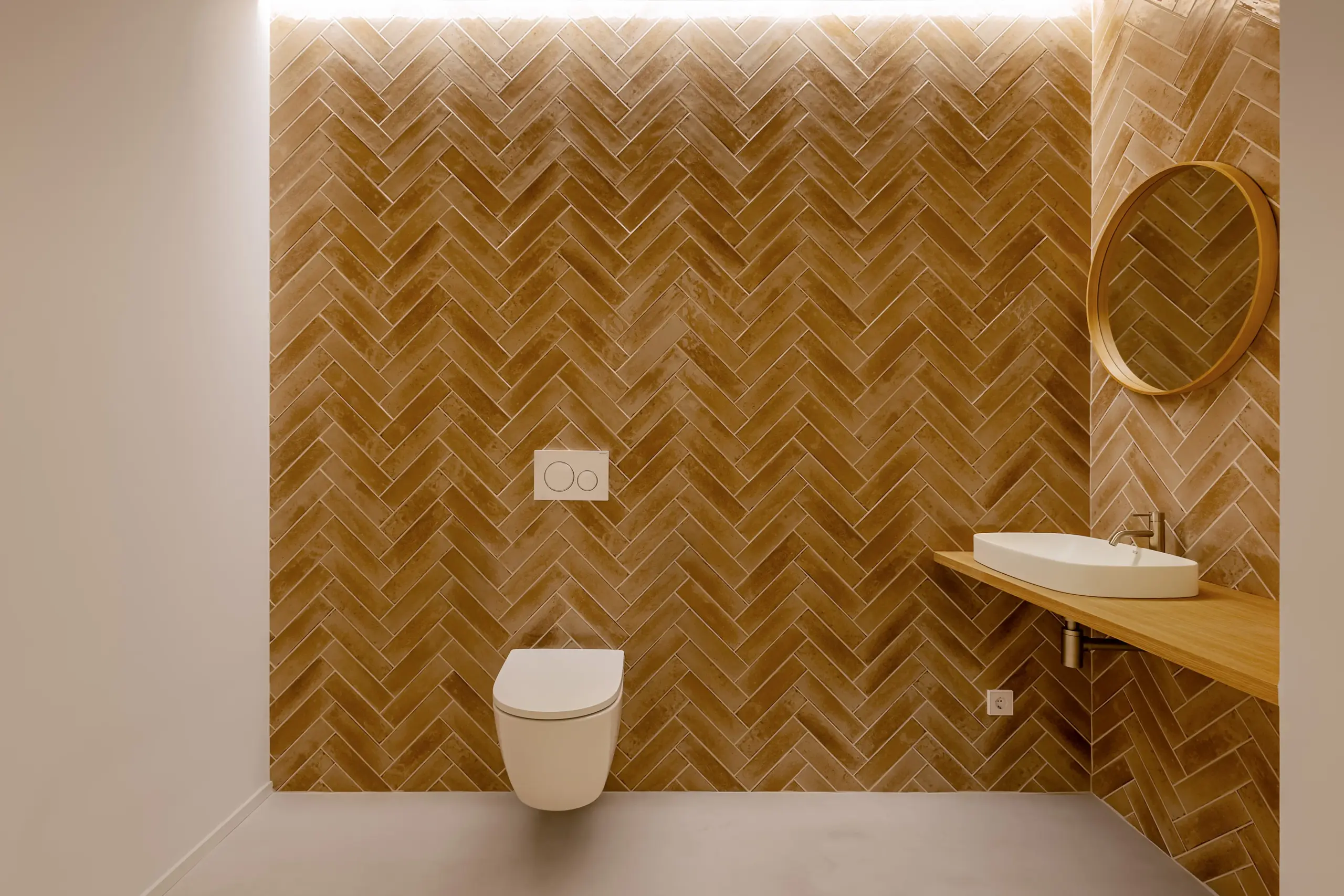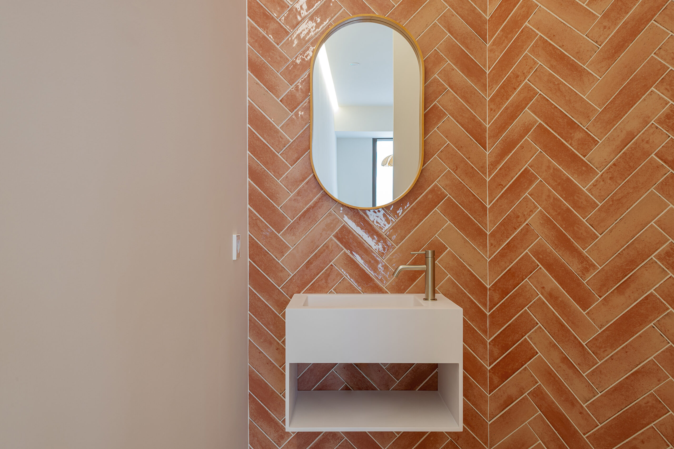 Para el acabado de suelos y paredes se optó por aplicar un revestimiento continuo de microcemento, un material resistente y fácil de mantener, que además aporta un aspecto natural y orgánico. En los baños se incorporó al diseño varios tabiques revestidos con azulejos en colores cálidos, colocados en espiga, un detalle que introduce dinamismo sin romper la coherencia general del proyecto.