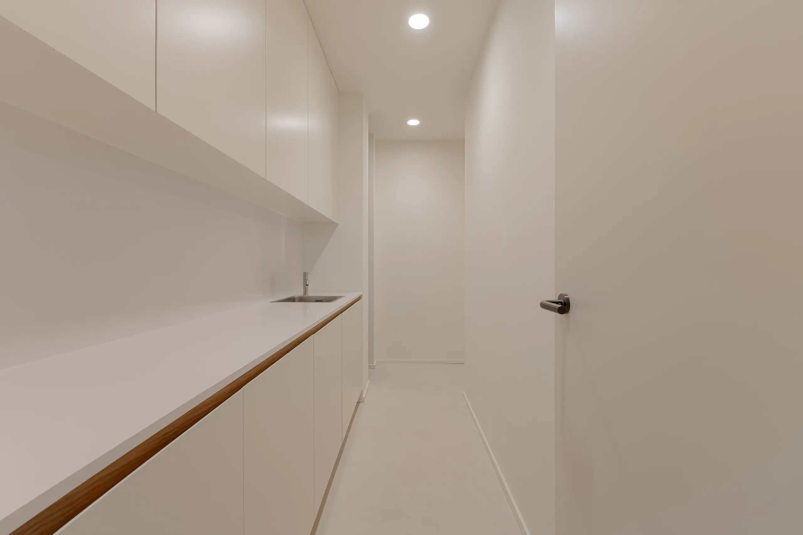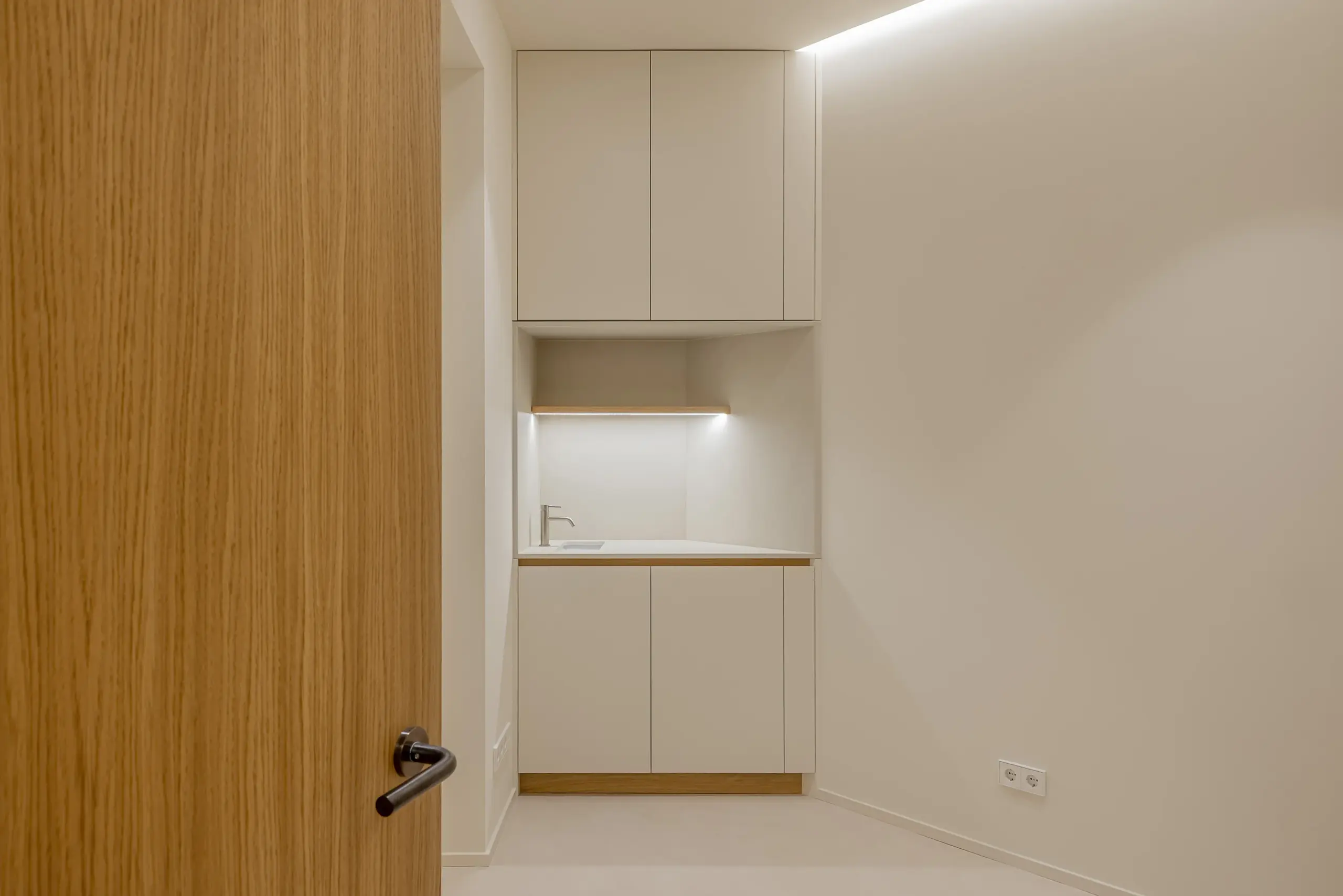 La iluminación también juega un papel importante, con mucha iluminación indirecta, oculta en oscuros perimetrales. El resultado es un espacio pensado para un uso sanitario, pero con un carácter arquitectónico marcado por la sencillez formal, la funcionalidad y la calidad constructiva.