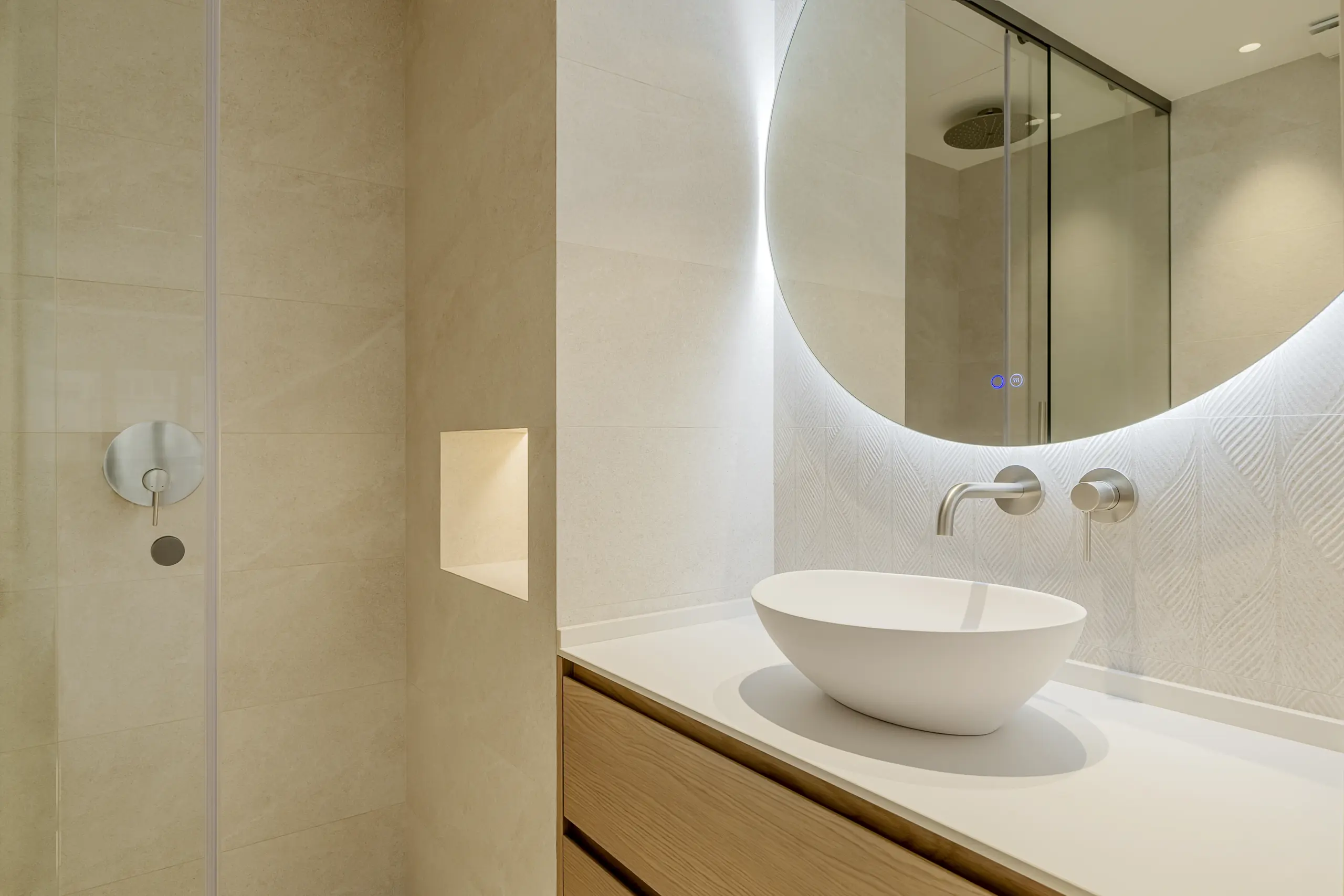 En el salón, la coherencia con los materiales se mantiene a través de un mueble de TV hecho a medida, que resuelve las necesidades de almacenamiento. La zona de noche, compuesta por tres habitaciones y dos baños, sigue la misma premisa de sobriedad, con armarios integrados de suelo a techo que maximizan el almacenamiento.