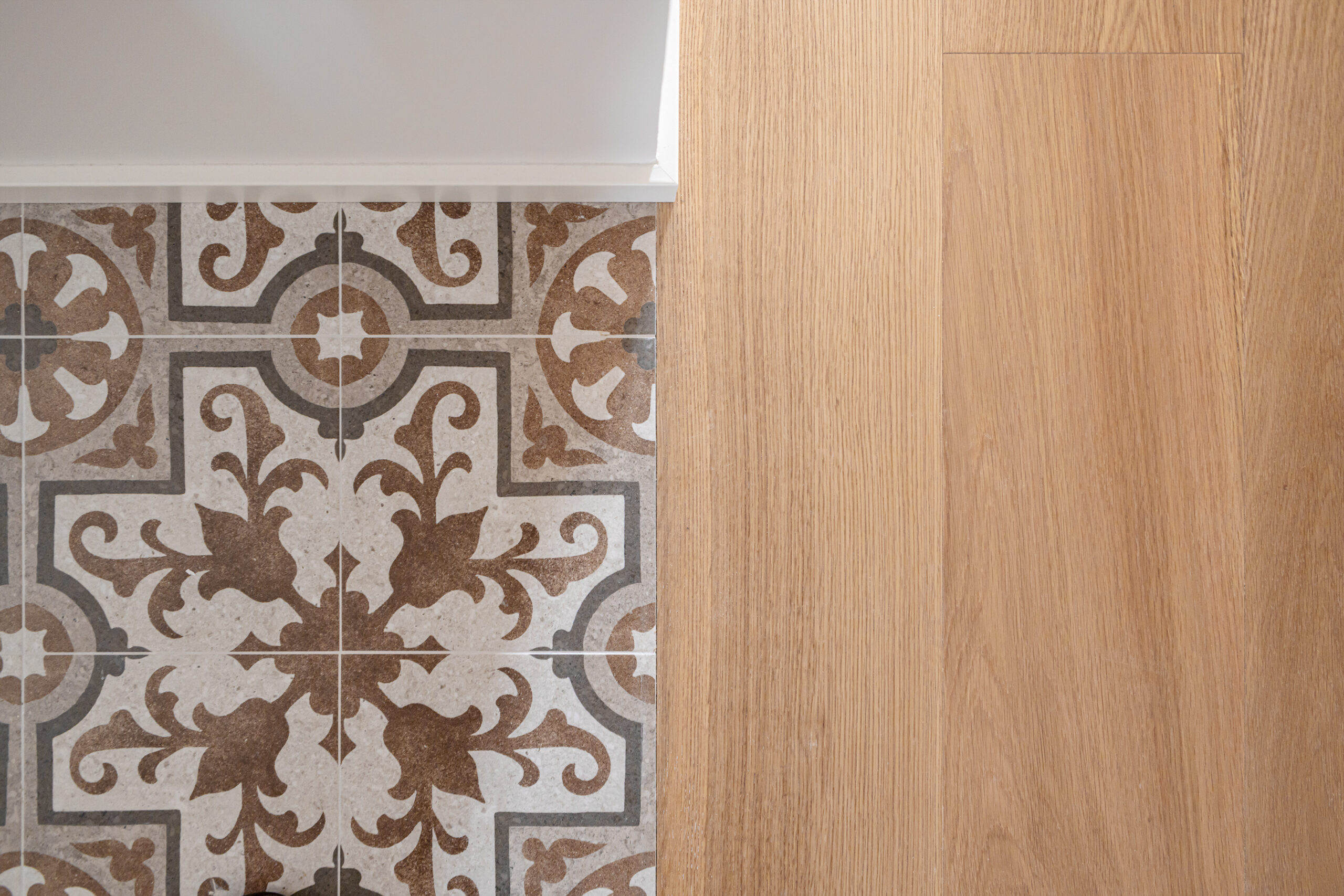 Los materiales juegan un papel fundamental en la atmósfera de la vivienda. El uso de madera de roble en el pavimento aporta una calidez y una textura que recorre todas las estancias, generando contraste con el blanco de las paredes y el mobiliario fabricado a medida. En la cocina, el diseño se articula en torno a una gran península que funciona como núcleo de la vivienda, combinando la zona de trabajo con un espacio social y de encuentro. Uno de los detalles más cuidados de la obra es la carpintería interior. Se instalaron puertas con marcos enrasados que integran las rejillas de climatización por conductos en el panelado superior, evitando elementos vistos en el falso techo.